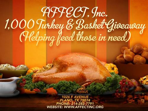 In November 2011 AFFECT, Inc. reached out and was able to feed 25 families with a turkey, and basket of canned goods and fresh vegetables. In 2012 AFFECT, Inc. was able to reach out and provide a healthy thanksgiving meal (16lb-20lb turkey, corn, green beans, bread, stuffing, mash potatoes, macaroni and cheese, and cranberry sauce) for 500 families across the Collin, Dallas, Denton and Kaufman counties.