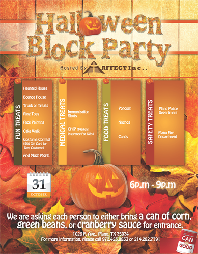 On October 31, 2011 AFFECT, Inc. hosted the 1st Fall Festival Halloween Block Party. Over 400 participants were in attendance for this outstanding event. This community endeavor provided a safe environment for AFFECT, Inc. to supply fun treats (e.g., Haunted Hospital, , Cake Walk, putt, putt, golf, & more..), food treats (healthy snacks & a few candy treats, etc.), medical treats (e.g., Immunizations & CHIP Registration), safety treats (e.g., Plano Police & Fire Department demonstrations on personal safety & fire rescue) to all those in attendance. This unique event was supported by over 50 volunteers from the community.