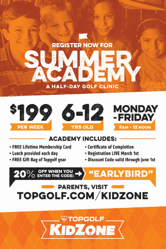Our Summer Academy is about to start! It is an academy based summer camp for kids ages 6-12. It is $199 per week and lasts Monday-Friday from 9 am to 12 pm! They are provided with a lifetime card, lunch, free gift bag and certificate of completion! Parents can visit topgolf.com/kidzone to sign up!
