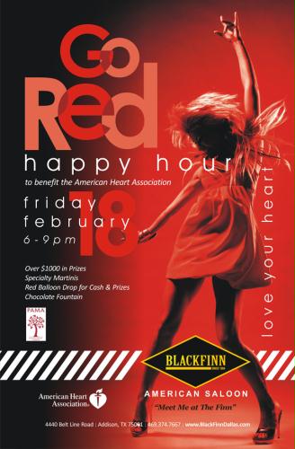 Young Professional of Plano has teamed up with BlackFinn and the American Heart Association for the GO RED HAPPY HOUR! Please come out and enjoy some complimentary healthy appetizers, pomegranate martinis and awesome raffle prizes!